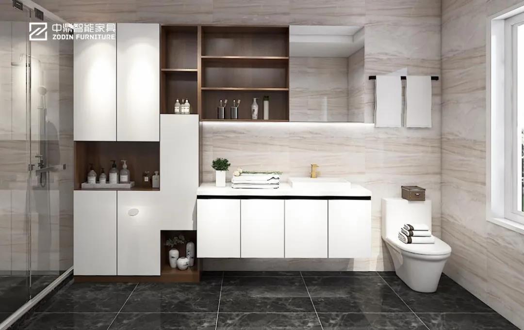 衛(wèi)生間雖然是家中面積小的空間,但卻是值得關(guān)注細節(jié)的地方。定制合適尺寸的全鋁浴室柜,讓柜體和墻體整體融合。側(cè)邊的開放柜設(shè)計,更讓小物件的收納得心應(yīng)手。